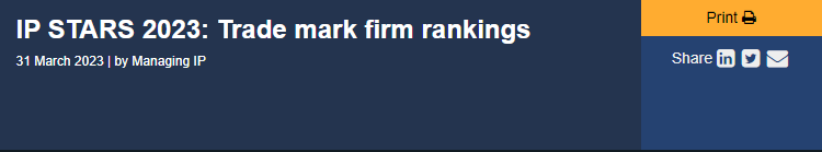 此前,“2023年度 IP STARS 商標(biāo)榜單”已于今年3月公布,華進(jìn)憑借專業(yè)的商標(biāo)團(tuán)隊(duì)和高質(zhì)量的客戶服務(wù)能力,榮膺2023年中國(guó)區(qū)商標(biāo)確權(quán)領(lǐng)域(Trade mark prosecution - domestic firms 2023)“知識(shí)產(chǎn)權(quán)之星”(IP STARS)推薦事務(wù)所。