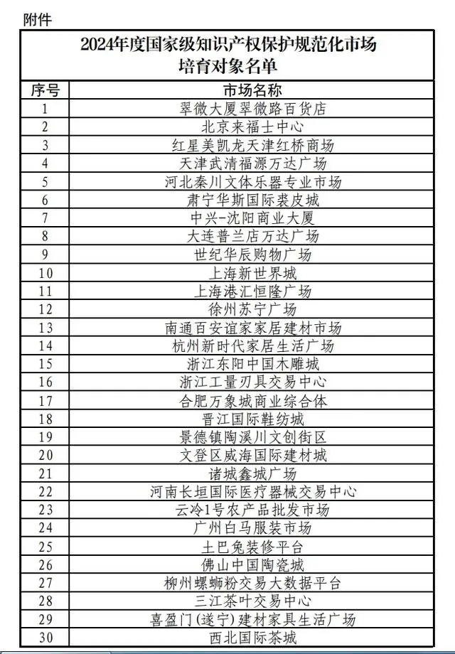 據國家知識產權局消息 近日,國家知識產權局公示了2024年度國家級知識產權保護規(guī)范化市場培育對象名單,30家市場榜上有名,培育期為2024年3月至2025年2月。