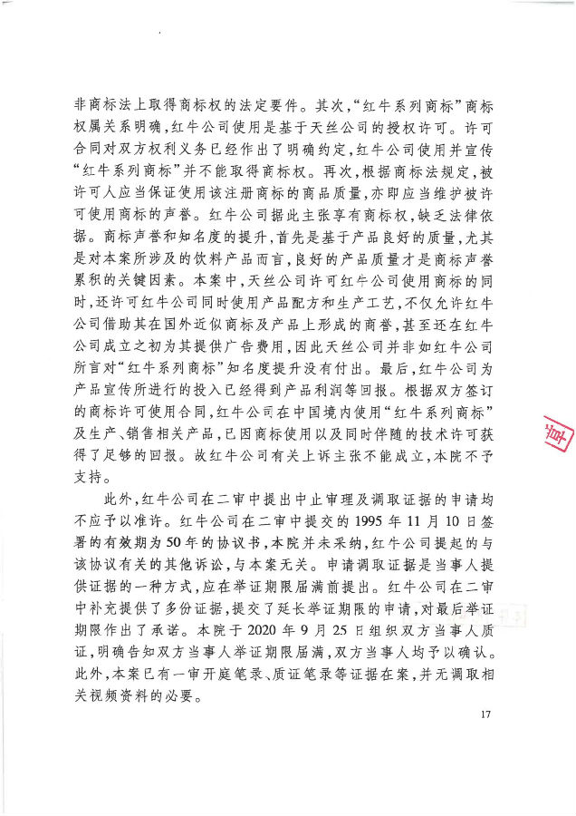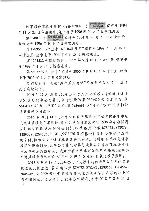 對此,中國紅牛表示不服并向最高法提起上訴。2020年4月,最高法對此立案,并依法組成了合議庭公開審理。
