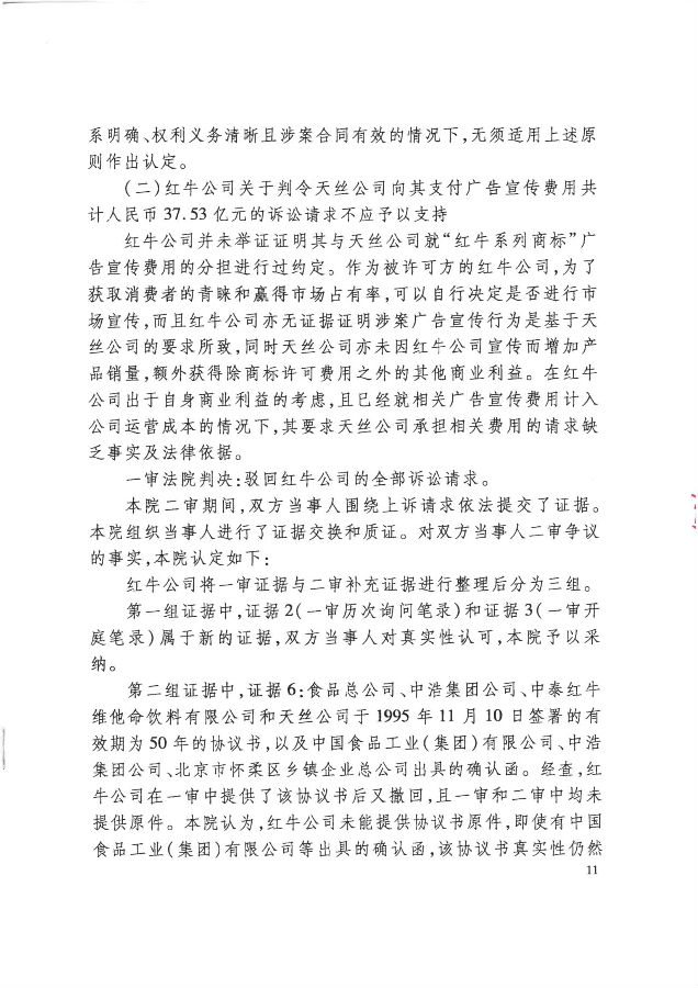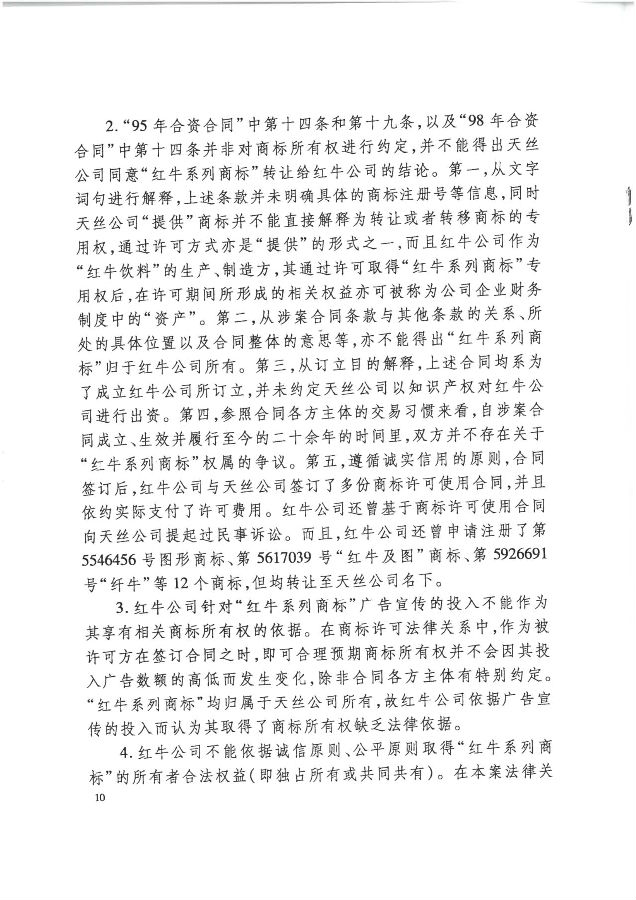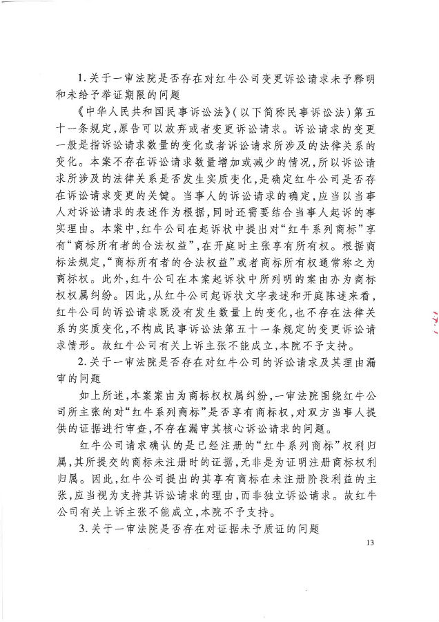 2019年11月25日,一審法院判決駁回了中國紅牛的全部訴訟請求。法院認定,該公司關于確認其對“紅牛系列商標”享有所有者合法權益的訴訟請求缺乏事實和法律依據,而有關37.53億廣告宣傳費的請求則不應予以支持。