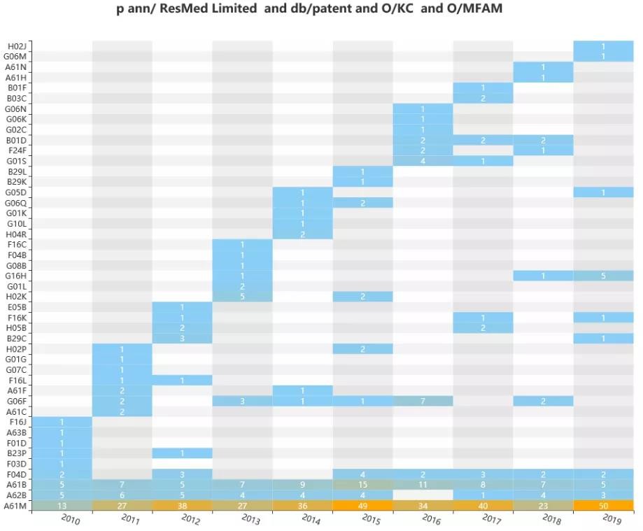 從上圖及表中可知,費雪派克與瑞思邁間的專利引用交集大,產(chǎn)品技術(shù)重疊度高,競爭最為激。怡和嘉業(yè)作為國內(nèi)企業(yè),可能是因為主要申請在國內(nèi),在審查中很少用到其它同行在先專利申請,很少有相互引用的數(shù)據(jù)體現(xiàn)。